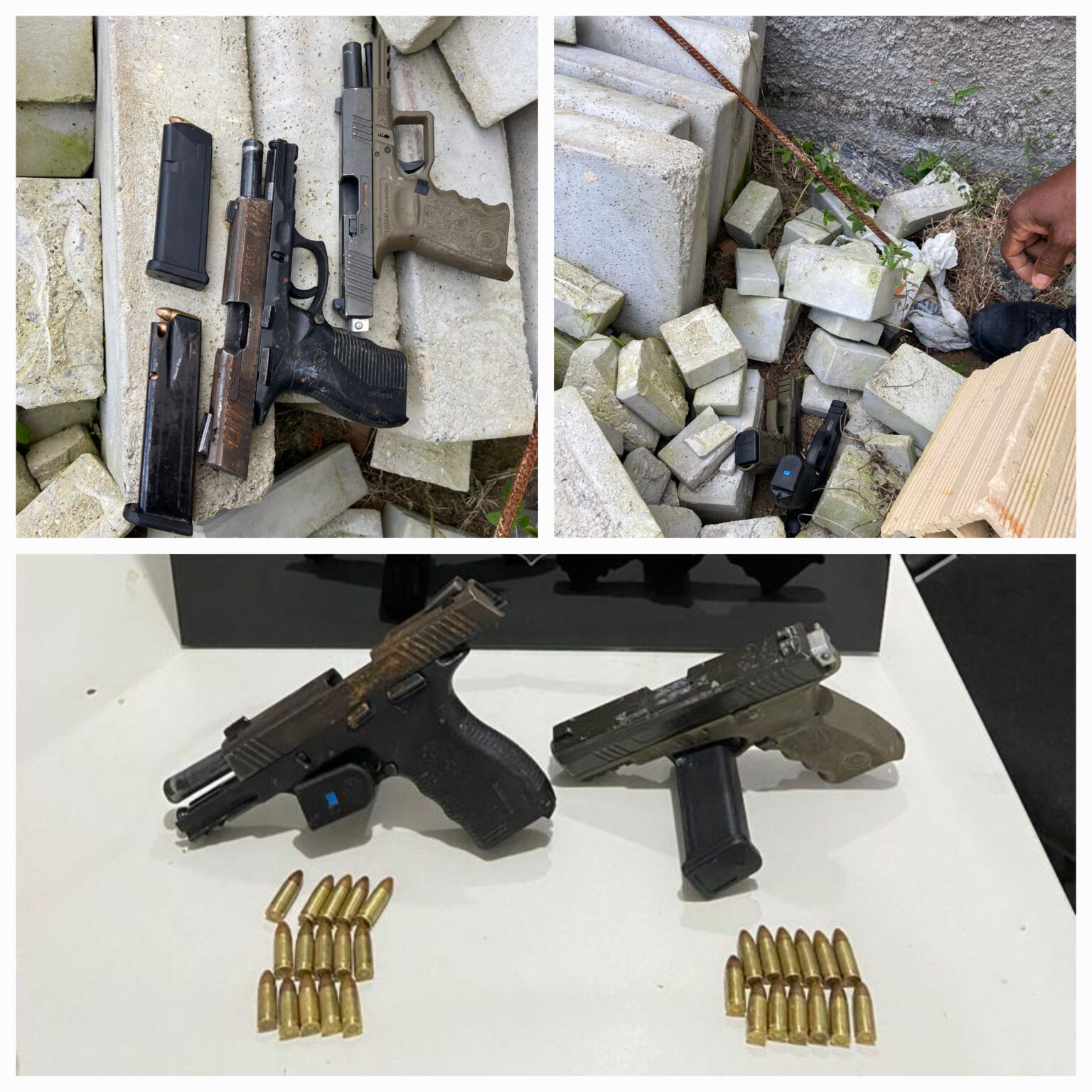 Apurou-se no curso das investigações que as duas pistolas, calibre 9mm, teriam sido utilizadas no crime. Elas foram localizadas embaixo de escombros próximo ao local onde parte dos autores foram presos em flagrante. (Assista)