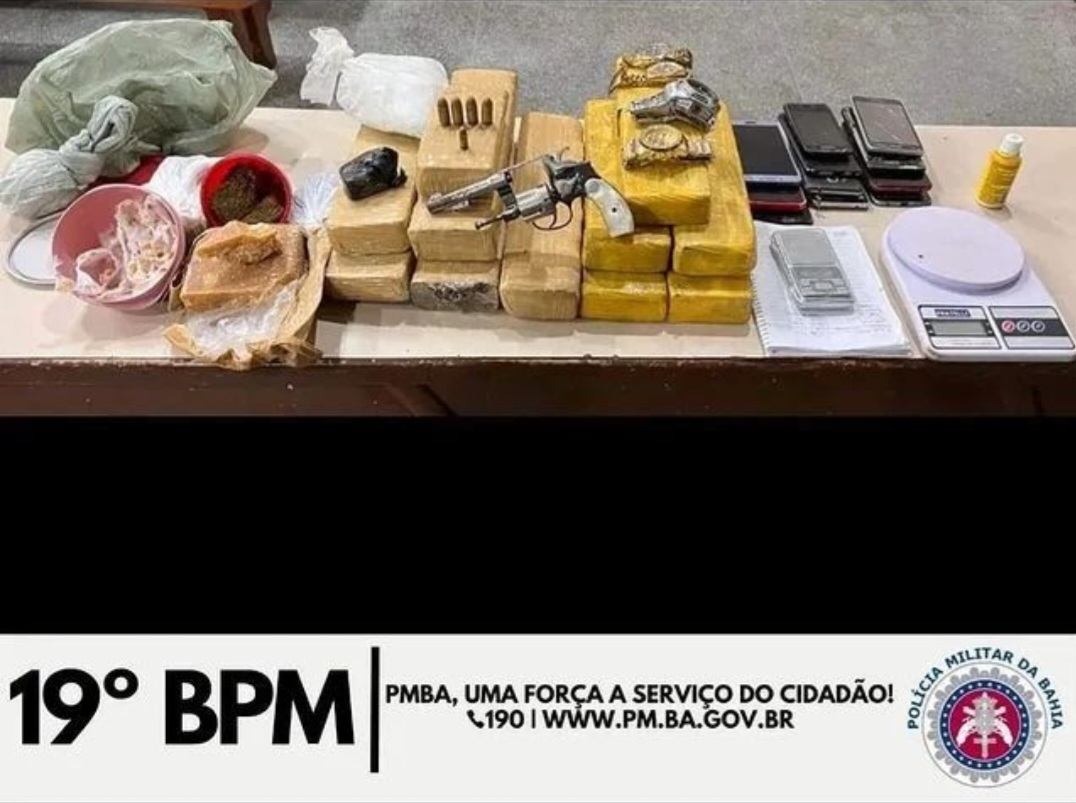 19° BPM realizavam rondas nas proximidades da Rua da Banca, no bairro Jequiezinho em Jequié quando bateram de frente com dois lazarentos a bordo de uma “cabrita” (motocicleta), sendo que o garupa estava portando uma mala. Ambos ao perceberem a presença da viatura, ficaram, “todo se bulindo”, (nervosos) e deram pinote, (empreenderam fuga), ao serem alcançados, foi encontrado na cintura do piloto da motocicleta, um “canela seca” revólver cal. .32 municiado. Na mala foi encontrado um kit lojinha completo; com materiais característicos do tráfico de drogas. Todo o material apreendido juntamente com os cramunhões foram apresentados na delegacia de Jequié.
