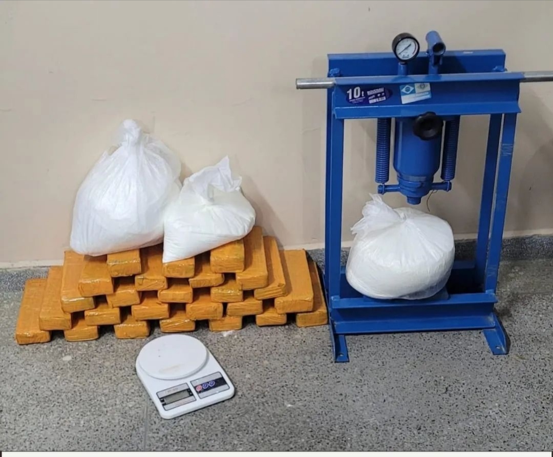 Segundo levantamento do estagiário, era boca de onze e pouca da manhã de ontem (14) quando militares do 19° Batalhão deslocaram para averiguar uma denúncia realizada através do Disk em Jequié. No bizu, foi relatado que dois Cramunhões estavam transportando substâncias suspeitas para o interior de uma residência, no Residencial Popular Cachoeirinha 01. Ainda conforme o papel, quando os guerreiros chegaram ao local, dois indivíduos saíram no pinote (empreenderam fuga) e tomaram destino ignorado. Na porta do barraco, do lado externo, foi encontrado um saco transparente com uma substância branca, análoga à cocaína. Já no interior da residência havia, numa caixa de papelão, 25 tabletes de maconha, bem como mais dois sacos de um pó branco, também característico da cocaína. Além disso, ainda foram encontradas uma prensa hidráulica e uma balança digital, demonstrando que o local trata-se de uma casa – cofre e laboratório de refino. Todo o material foi apresentado à autoridade competente na delegacia da Cidade Sol.