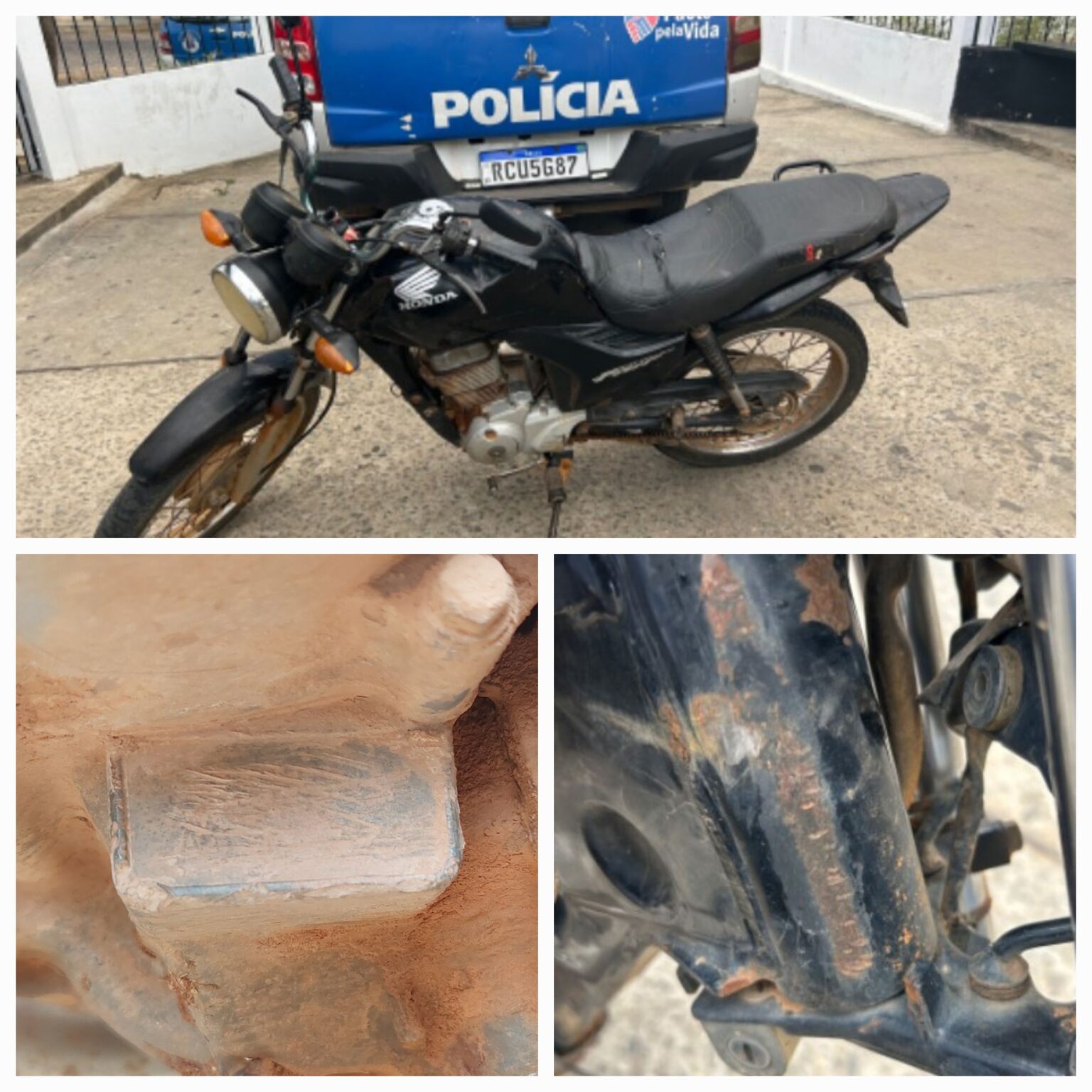 Motocicleta estava sem placa de identificação e com os caracteres do Chassi e Motor suprimidos | Foto: Grupo de WhatsApp dos praças