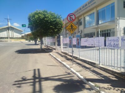 Faixas e cartazes fixados na frente do Fórum| Foto: Marcos Vinicius