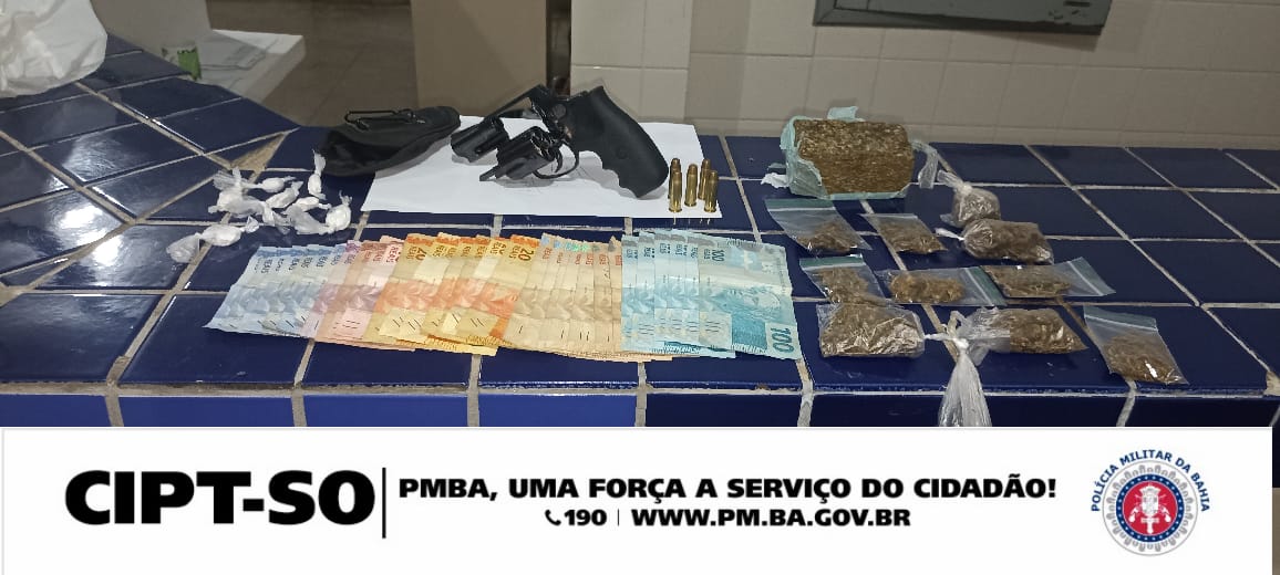 Durante buscas na “posse” foi encontrado um revólver TAURUS calibre .38, totalmente municiado, no baculejo (busca pessoal), foi achado certa quantidade de drogas bem como uma boa quantia em dinheiro, que no perguntado o “Gêmeo” largou que seria proveniente do tráfico.