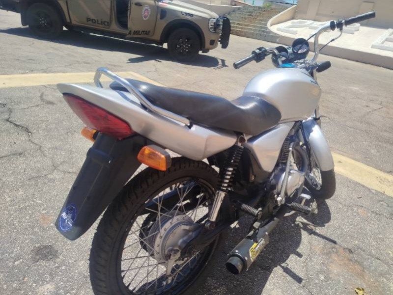 A Honda CG 150 prata, toda “disfarçada”, foi vista pela Polícia Militar lá na Avenida Horácio José dos Santos, no bairro Feliciano Pereira Santos, perto do Atacadão. De longe já dava pra perceber que tinha coisa errada: a cabrita estava sem placa, sem retrovisor e o condutor sem juízo.