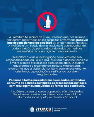 A administração pede que todos redobrem os cuidados, evitando o consumo de bebidas destiladas sem rotulagem, de procedência duvidosa ou adquiridas de fontes não confiáveis.