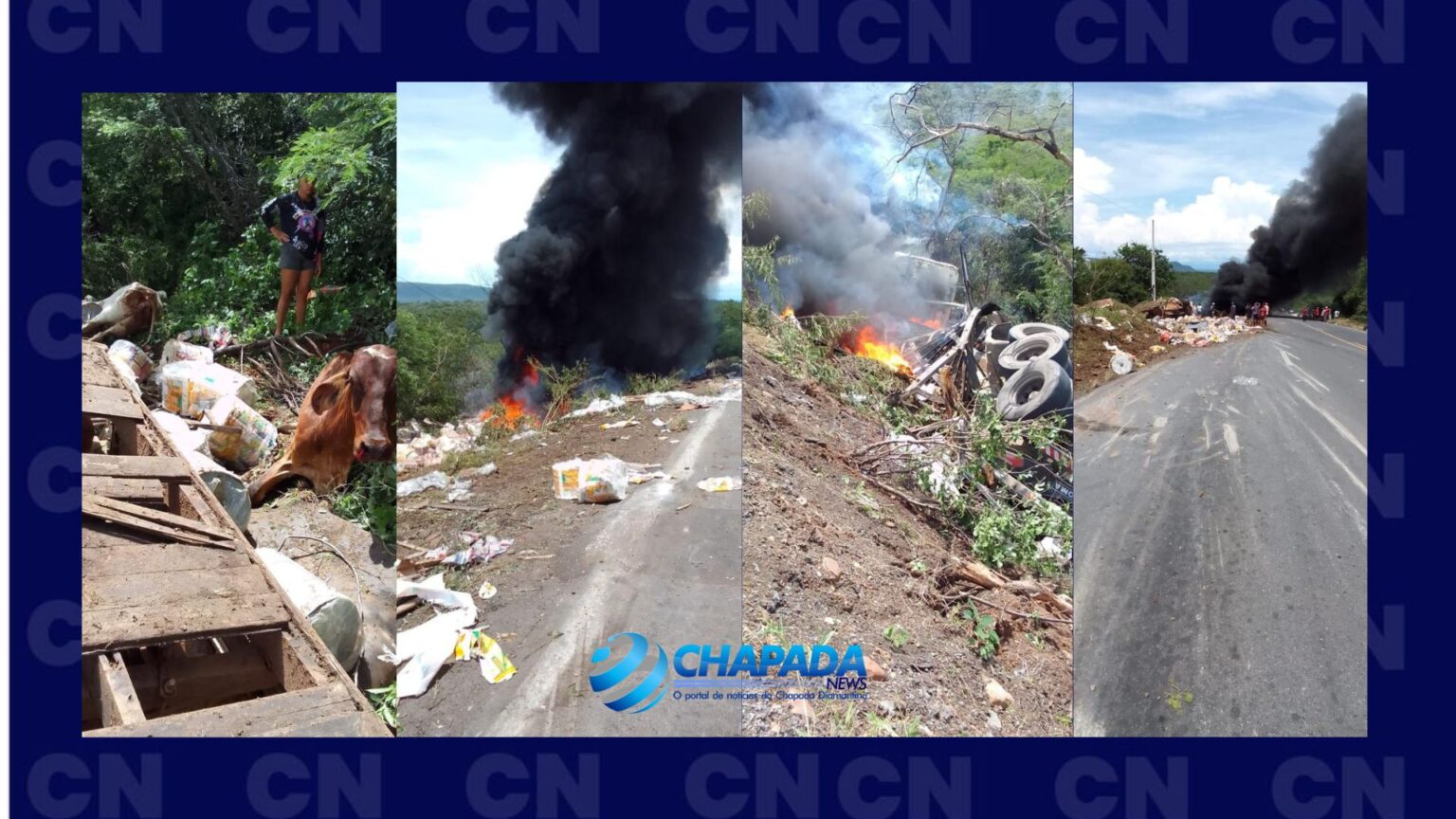 Com a colisão a carreta pegou fogo. Já o ‘Boiadeiro’ estava carregado com quatro bois, e assim como o condutor, todos morreram, em meio à vegetação.