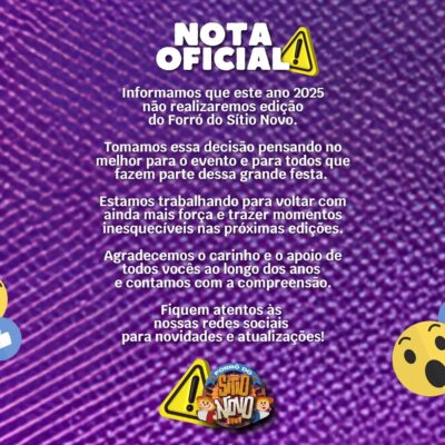 A produção do evento informou que os seguidores e clientes devem ficar atentos nas redes sociais do Forró do Sítio Novo para novidades e atualizações. Leia a nota na íntegra:
