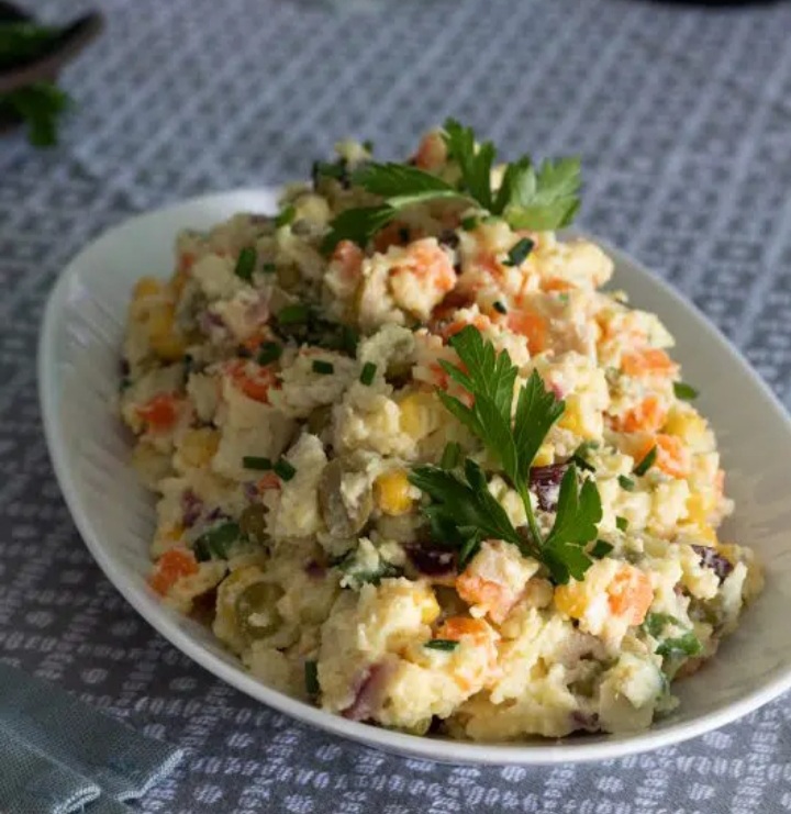 - Distribua muito bem todos os ingredientes, tempere com cheiro verde e sirva gelado ou em temperatura ambiente