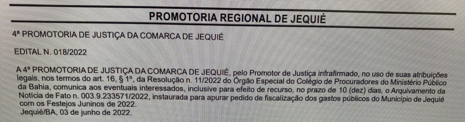 Por este motivo, não é de se causar nenhuma surpresa que o Ministério Público não tenha atendido o pedido que, como já dito, não encontra fundamento na economia, nem na tradição, nem em nada que se possa argumentar que não seja a mais pura e simples tentativa de atrapalhar o comércio, a geração de emprego e a celebração da cultura popular por um povo que merece cultuar suas raízes após 2 anos de impedimento pela pandemia Covid-19. É, também, óbvio que o município de Jequié é grande o suficiente para promover seu evento da forma brilhante como merece.
