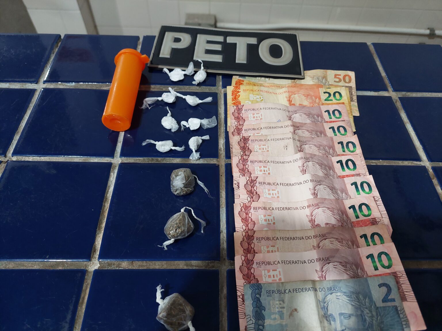 Durante o baculejo, foi localizado três buchas de maconha e oito porções de cocaína além de dinheiro em células trocadas, uma cu de sapo de 14 anos que estava na garupa do namorado maconheiro foi entregue aos pais no local.