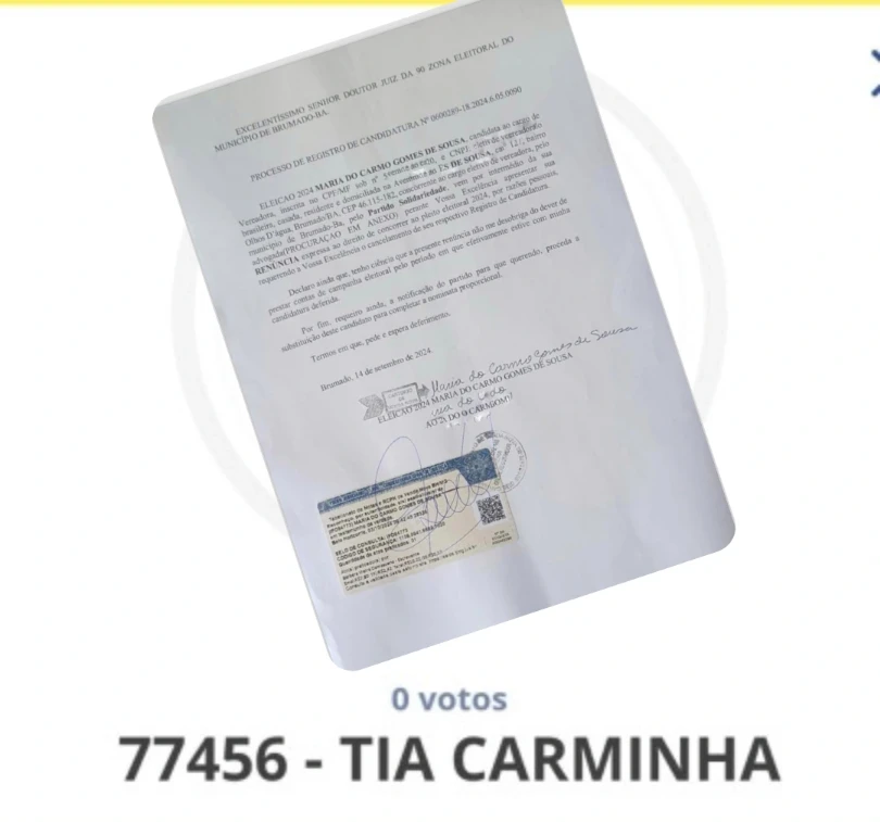 Diferente do que tinha publicado o Portal É Fuxico dando conta que a Candidata Tia Carminha não teria recebido nem o próprio voto (Veja). A assessoria Jurídica e familiares da então candidata, segundo o TSE, procuraram a redação esclarecendo o fato. De posse de um ofício, foi confirmado que desde o dia 14 de setembro, Tia Carminha teria pedido a renúncia de sua candidatura. Os representantes de Maria do Carmo informaram que a mesma não estava na cidade, pois teria viajado para tratar de assuntos particulares em outro estado, por este motivo, não há registro de votos. Os representantes esclareceram ainda que o pedido ainda aguarda julgamento e logo será inserido no sistema do TSE, ocasião em que será corrigido o status da candidatura Tia Carminha no divulgacand 2024.