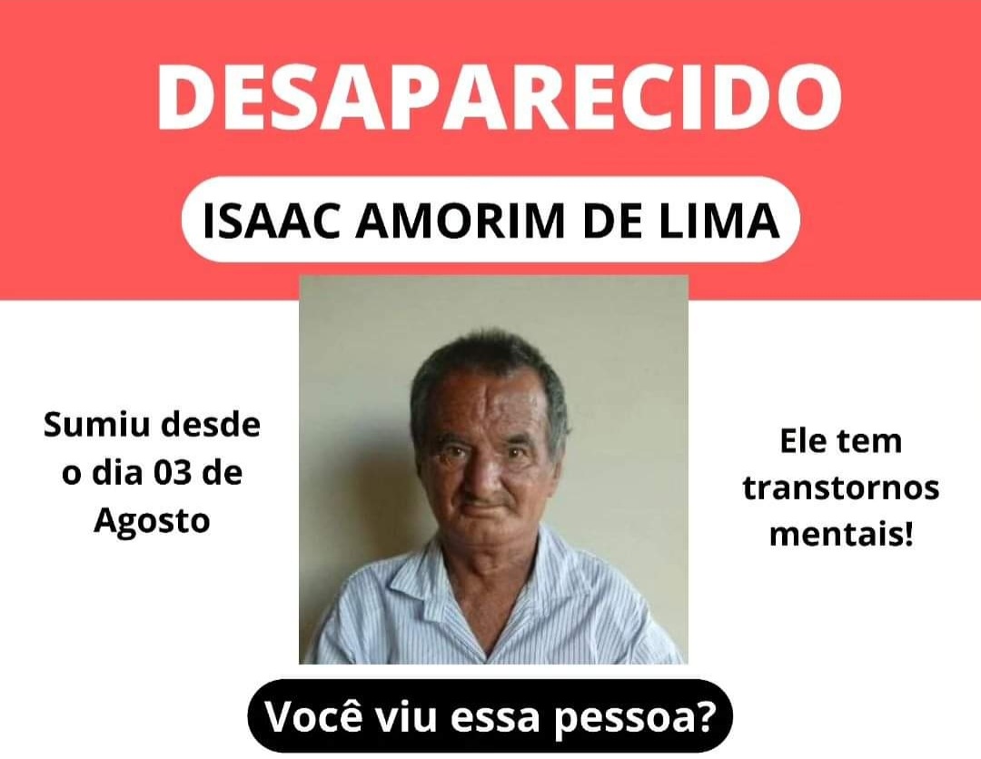 A família informou ainda, que Isac saiu de casa por volta de 14:30h e desde então não foi mais visto. Informaram também que o idoso sofre de transtornos mentais e faz uso de medicação controlada. Um boletim de ocorrência foi registrado na Polícia Civil informando o desaparecimento.