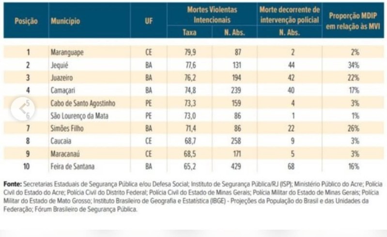 O município que lidera a lista é Managuape, no Ceará, com 79,9 mortes violentas a cada 100 mil. Na sequência, vêm três cidades baianas: Jequié, com 77,6; Juazeiro, com 76,2; e Camaçari, 74,8. As cidades pernambucanas de Cabo de Santo Agostinho e São Lourenço da Mata aparecem na quinta e na sexta posição, com 73,3 e 73,0, respectivamente.