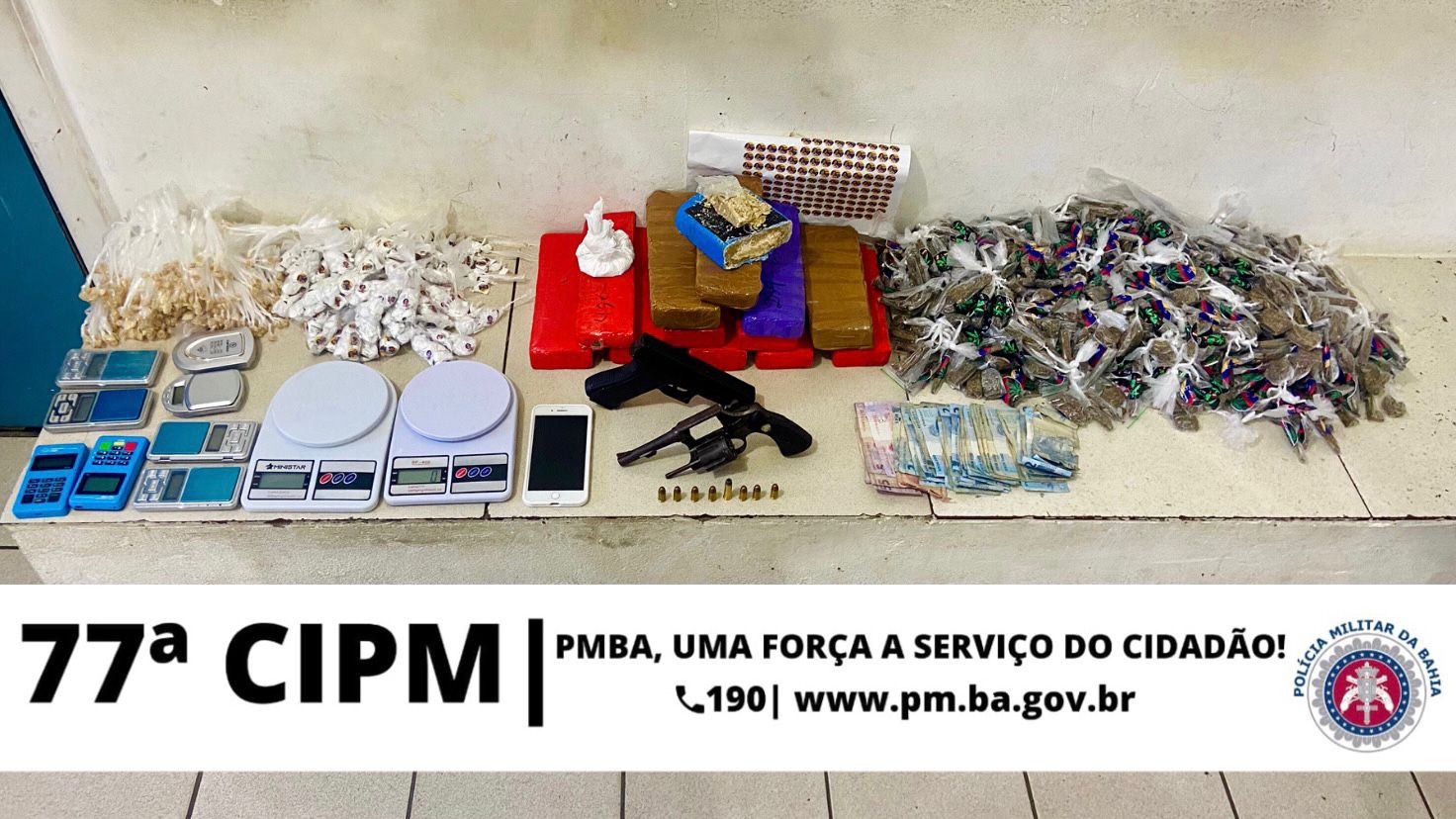 A primeira brocada segundo o grupo de WhatsApp dos praças, se sucedeu boca de três horas da tarde, (15 horas) desta quarta-feira (24), quando os militares do PETO Motos da 77ª CIPM em patrulhamento tático em Vitória da Conquista, avistaram uma motocicleta, na qual o Cu de Galinha do condutor, ao perceber a presença dos Guerreiros, tentou sair vuado e arremessou uma sacola ao solo. O cabrito foi alcançado e durante o baculejo foi encontrada na cintura do Lazarento, um canela seca (revólver .38) com uma munição, dinheiro em espécie e um aparelho celular. Na sacola arremessada foi encontrada uma “lojinha” com diversos tipos de drogas, prontas para comercialização. Os guerreiros informaram que após o perguntado durante diligência continuada foi encontrado um barraco que era utilizado como depósito do tráfico, lá foram encontradas uma grande quantidade de drogas do capeta, balanças de precisão, embalagens para acondicionamento de drogas, maquinetas de cartão de crédito, munições e um simulacro de pistola.
