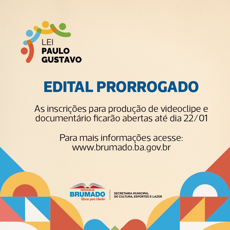 Foi prorrogado pela Prefeitura de Brumado o prazo de inscrição para o edital de chamamento público, referente à Lei Paulo Gustavo. No valor de R$580.000,00, o concurso é voltado para videoclipe, documentário, literatura, cinema e festival de música. Os interessados poderão se inscrever até o dia 22 de Janeiro. Os editais podem ser vistos na…