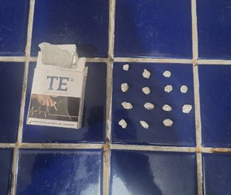 Durante a busca, foi encontrada uma carteira de cigarro contendo 14 pedras de crack embaladas e prontas para o comércio.