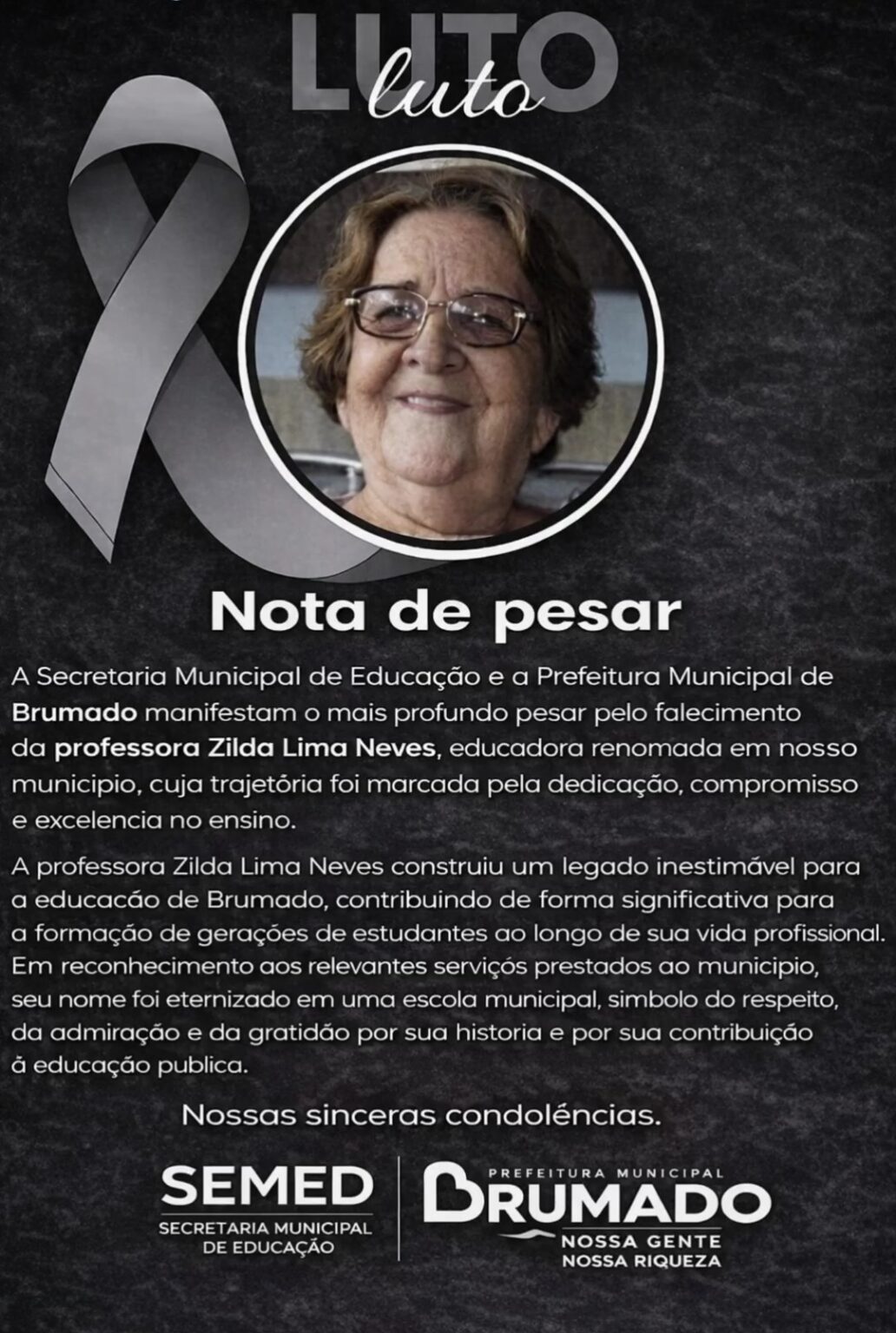 Diante da perda, a Secretaria Municipal de Educação, juntamente com a Prefeitura Municipal de Brumado, emitiu uma nota de pesar, destacando a dedicação, o compromisso e a excelência da educadora, além de manifestar solidariedade aos familiares, amigos e à comunidade escolar. Leia na íntegra: