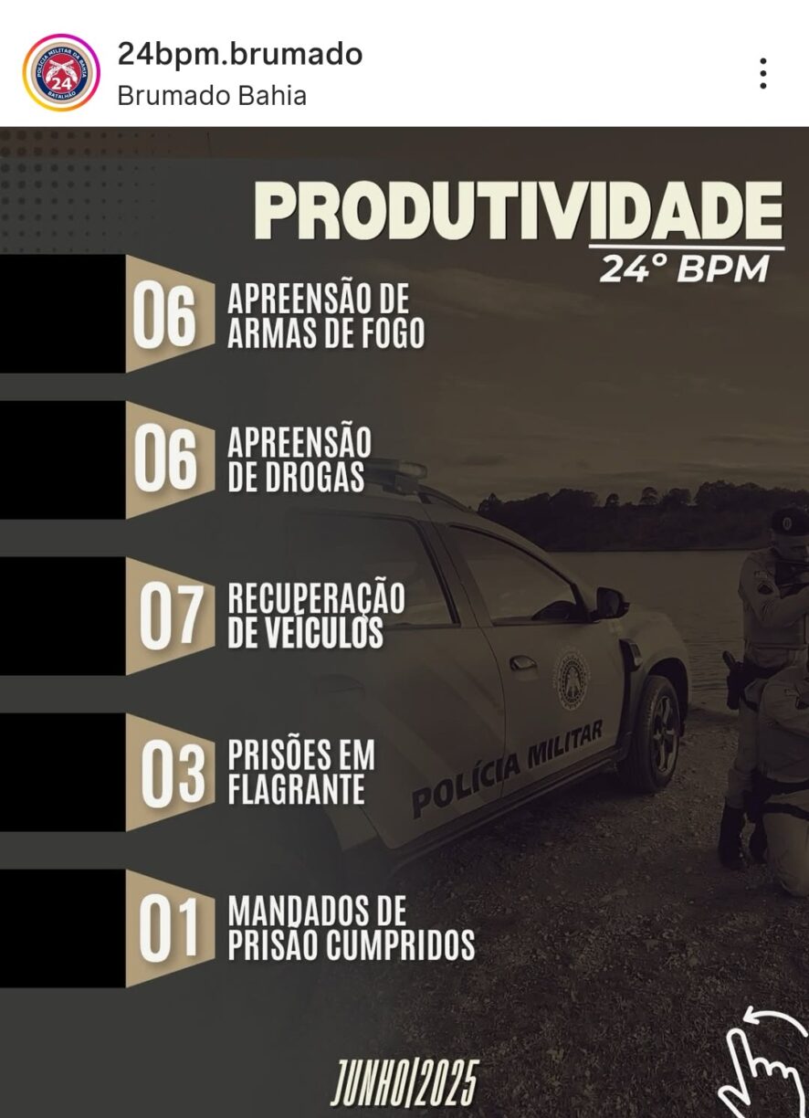 O 24° BPM (O Guardião dos Portais da Chapada e Sertão), responsável pela segurança de Brumado e mais seis cidades na Chapada e no Sertão Produtivo baiano, divulgou nesta semana (7) os números da sua produtividade referentes ao mês de junho de 2025. O balanço inclui ações preventivas, ostensivas e repressivas.