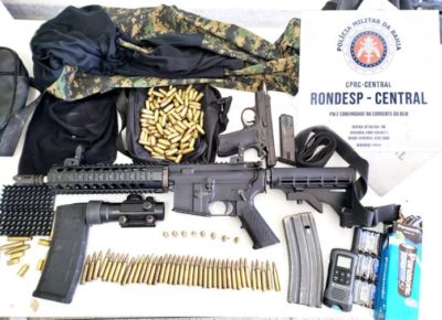 Denúncias sobre a presença de um grande grupo de homens armados, no bairro de Águas Claras, em Salvador, e de disparos na região, levaram equipes da Polícia Militar até uma casa onde foram apreendidos um fuzil M4 calibre 5,56 e dois carregadores, uma pistola Bessa calibre 9 mm, mais de 100 munições de diversos calibres, rádio comunicador, entre outros materiais, na manhã da última quarta-feira (18/11).