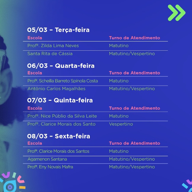 O projeto da Prefeitura de Brumado vai realizar triagem oftalmológica em mais de 9 mil estudantes e cerca de 600 professores do 1° ao 9° ano de ensino da rede pública. A triagem é feita de forma segura, totalmente indolor e com um aparelho de alta tecnologia. Após realizada a triagem em todas as escolas participantes do projeto, os pais e/ou responsáveis do estudante irão receber um relatório informando se foi identificado alguma alteração na saúde ocular da criança. Caso seja, o estudante será encaminhado gratuitamente para uma consulta oftalmológica. Confira na imagem abaixo o cronograma das triagens nesta primeira semana do Ver Mais Brumado.