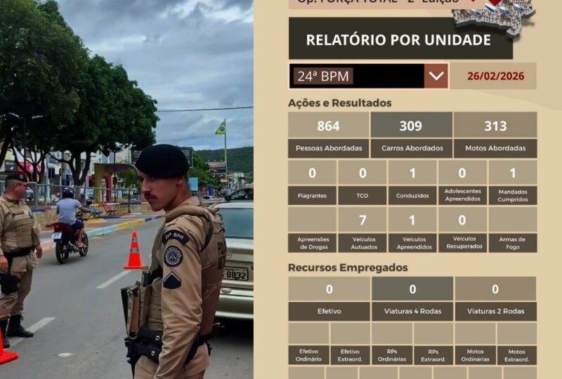 Em Brumado e nas demais cidades da região, o balanço foi divulgado nas redes sociais do 24º Batalhão de Polícia Militar (24º BPM), detalhando os resultados alcançados ao longo da operação.