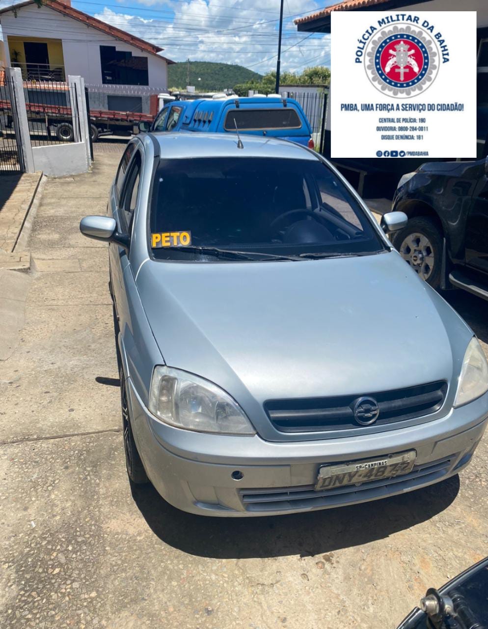 Por volta das 11 horas e 30 minutos, o PETO estava realizando policiamento ostensivo no condomínio popular brisas quando deu ordem de parada a um GM/Corsa Sedan Joy de cor prata registrado no estado de São Paulo, com as placas de identificação dobradas que era conduzido por um jovem de 17 anos (Sem CNH)