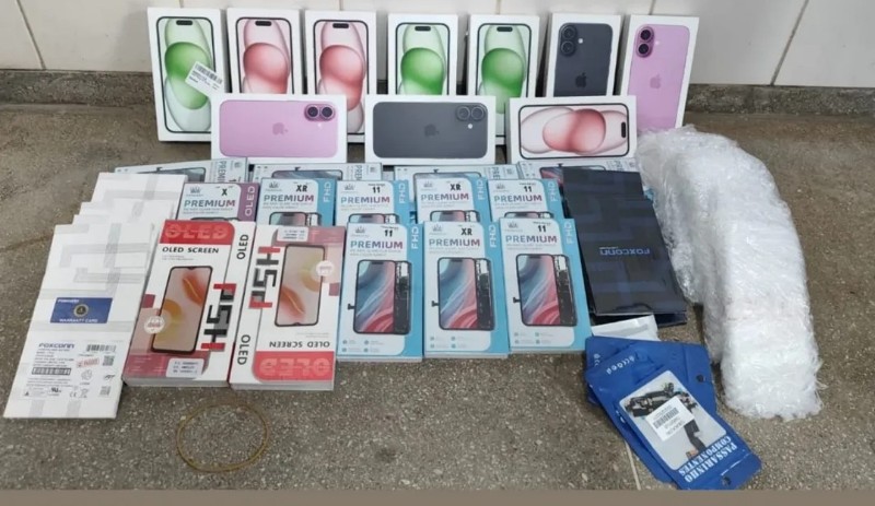 Durante o baculejo no bagageiro, os policiais acabaram encontrando um volume meio suspeito. Quando abriram, descobriram que era um monte de aparelho celular e peças de iPhone, tudo sem nota fiscal.