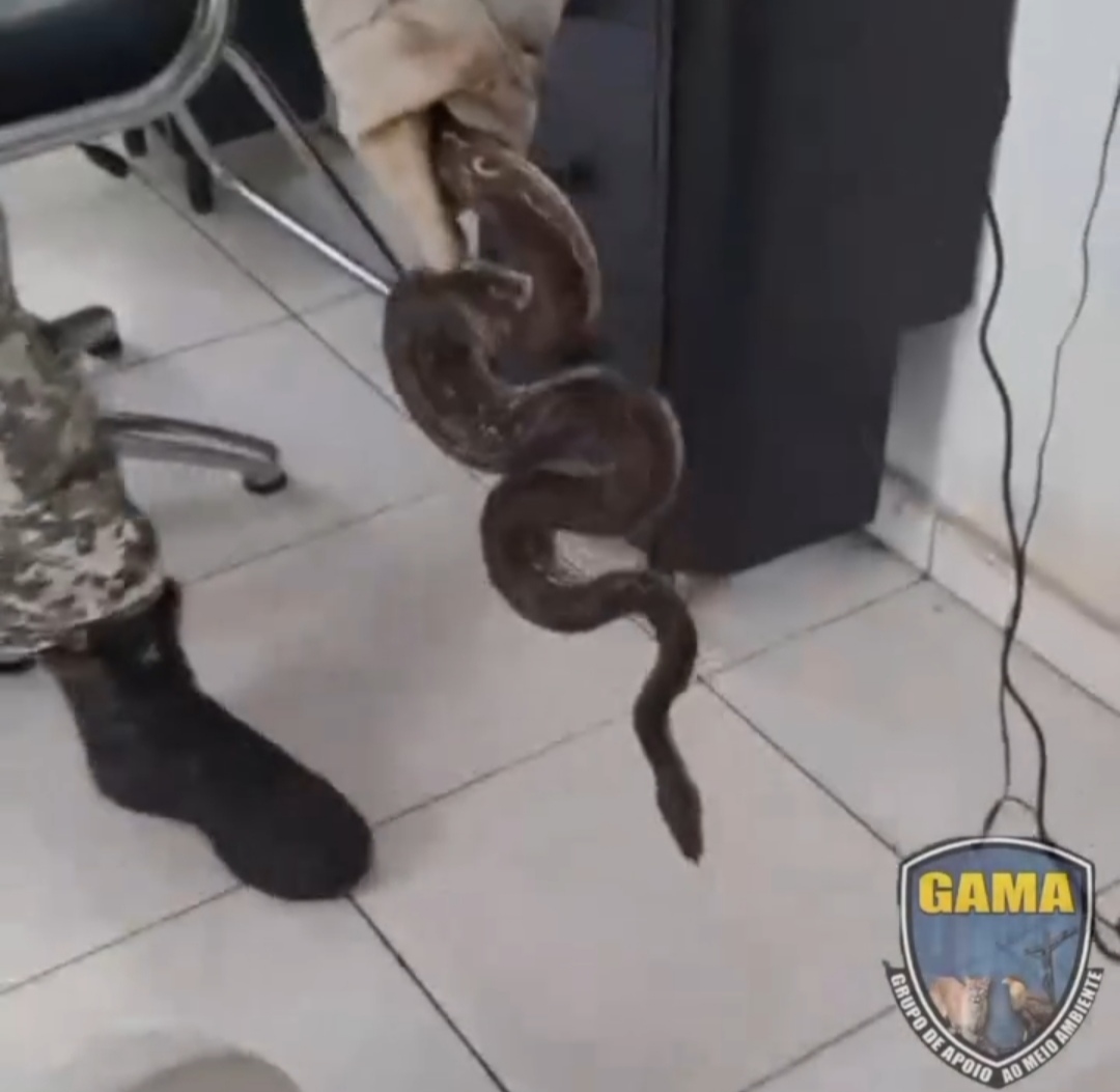 A bitela foi encontrada por um cliente da barbearia que levou um susto da porra ao ver a roliça. O Grupo de Apoio ao Meio Ambiente da Guarda Municipal de Conquista, capacitado para mexer com a bicha, foi acionado para fazer o resgate e a remoção do animal até o Cetas.