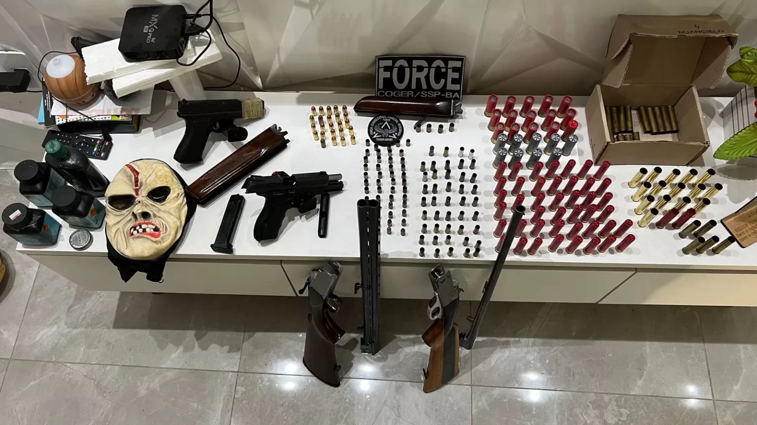 Além dos mandados de prisão temporária, foram cumpridos ainda dez mandados de busca e apreensão em endereços residenciais, comerciais e em unidades policiais nas quais estão lotados alguns dos alvos, localizadas em Ribeira do Pombal e Cipó. Foram apreendidas armas, entre metralhadoras e espingardas, munição, drogas, além de celulares e documentos.