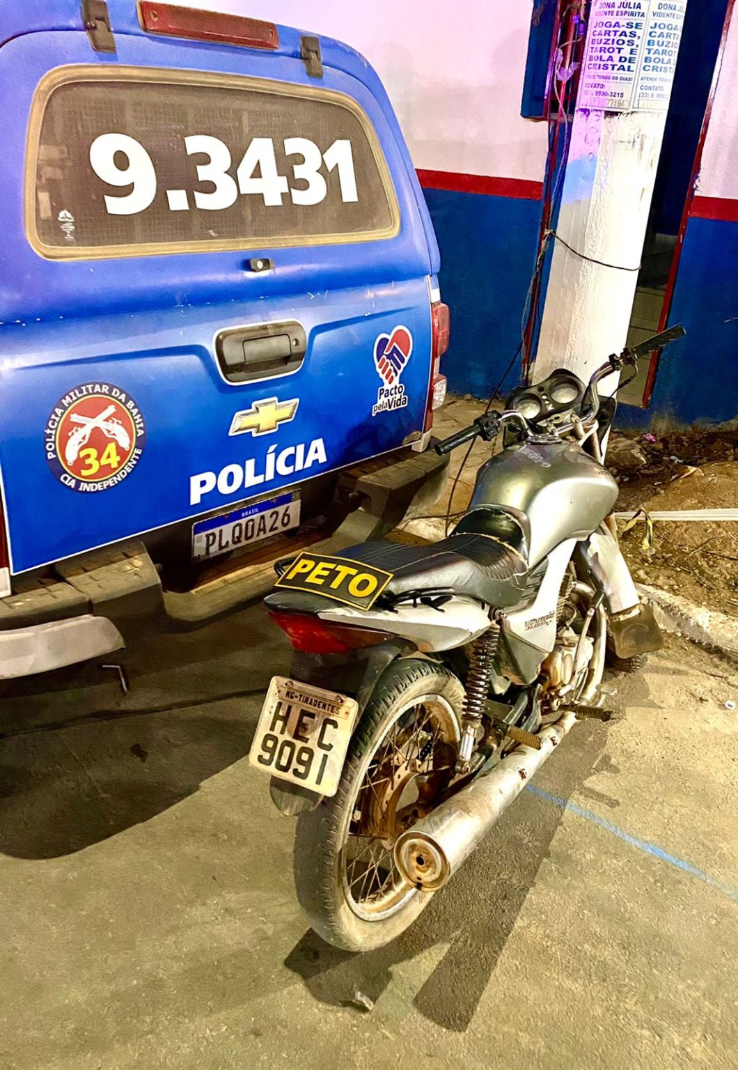 Segundo o bizu de uma desgraça dorminhoca, os militares do Pelotão Tático realizavam verificações em alguns veículos, momento que descobriram uma cabrita estacionada, a bichinha estava tomando boca, estava toda se querendo, toda se bulindo para os policiais e em consulta no sistema policial foi verificado que a placa que a danadinha estava trazendo coladinha na Honda era na verdade de uma Yamaha “montarias completamente diferentes, é ou não é?”, como também as numerações de chassi e motor estavam mais raspadinhas que “pepeca de nigrinha” uiiiiii negaaaaaaa!. O dono da cabritinha não apareceu para reclamar a posse da danadinha. Com isso, os Petianos recolheram a “raspadinha” e apresentaram às autoridades locais.