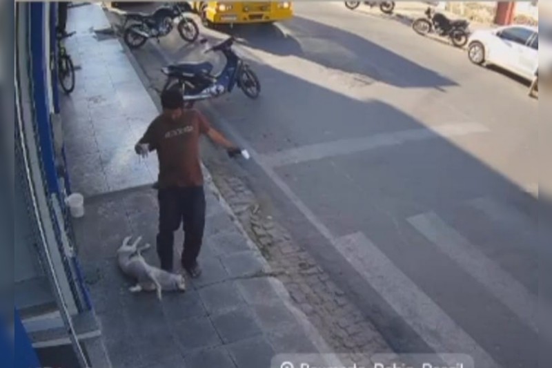 A câmera de um comércio registrou o momento da agressão contra o animal (veja). Na imagem, é possível ver o homem chutando o animal que dormia na calçada.